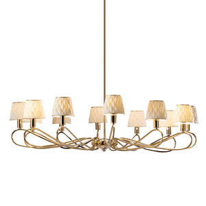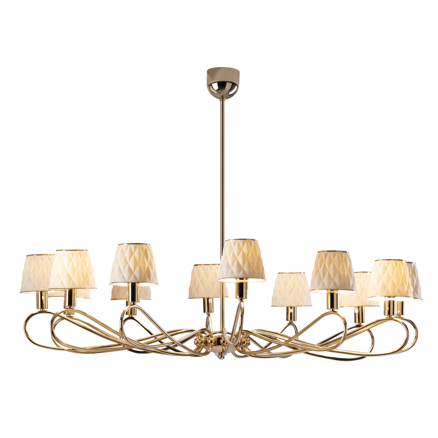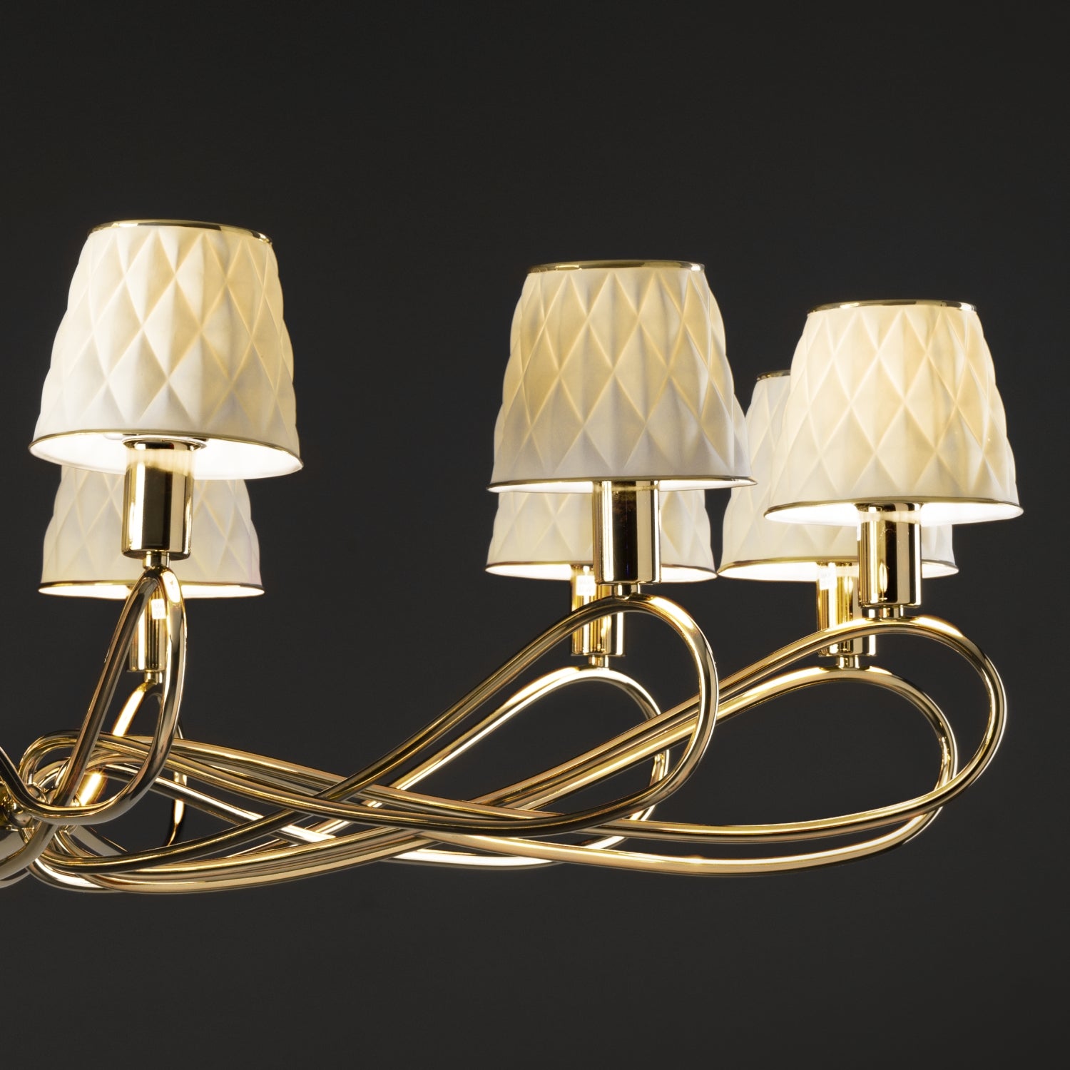 Supported by a sturdy brass frame, this spectacular Infinity chandelier strikes with its exceptional elegance. Its tiered silhouette comprises 12 sinuous arms, each sustaining a refined lampshade crafted of matte white porcelain. By folding on themselves, the arms produce a captivating sense of movement. The deeply embossed 3D style all over diamond shaped pattern on the lamp shades lends this piece an ornate sophistication.The overall effect is simultaneously ethereal and striking. Team with matching Infinity lighting accessories to complement the look.12 Light ChandelierCollection : InfinityInspired by the infinity symbolPorcelain shades creating a soft and warm atmosphereA trendy work of artMaterial: brass 24 ct gold plated, handmade porcelainPorcelain Shades : Matt white color Beautiful 24ct gold detailing Dimensions: H80 x Ø120 cm.Weight : 10 KgHandmade in Italy